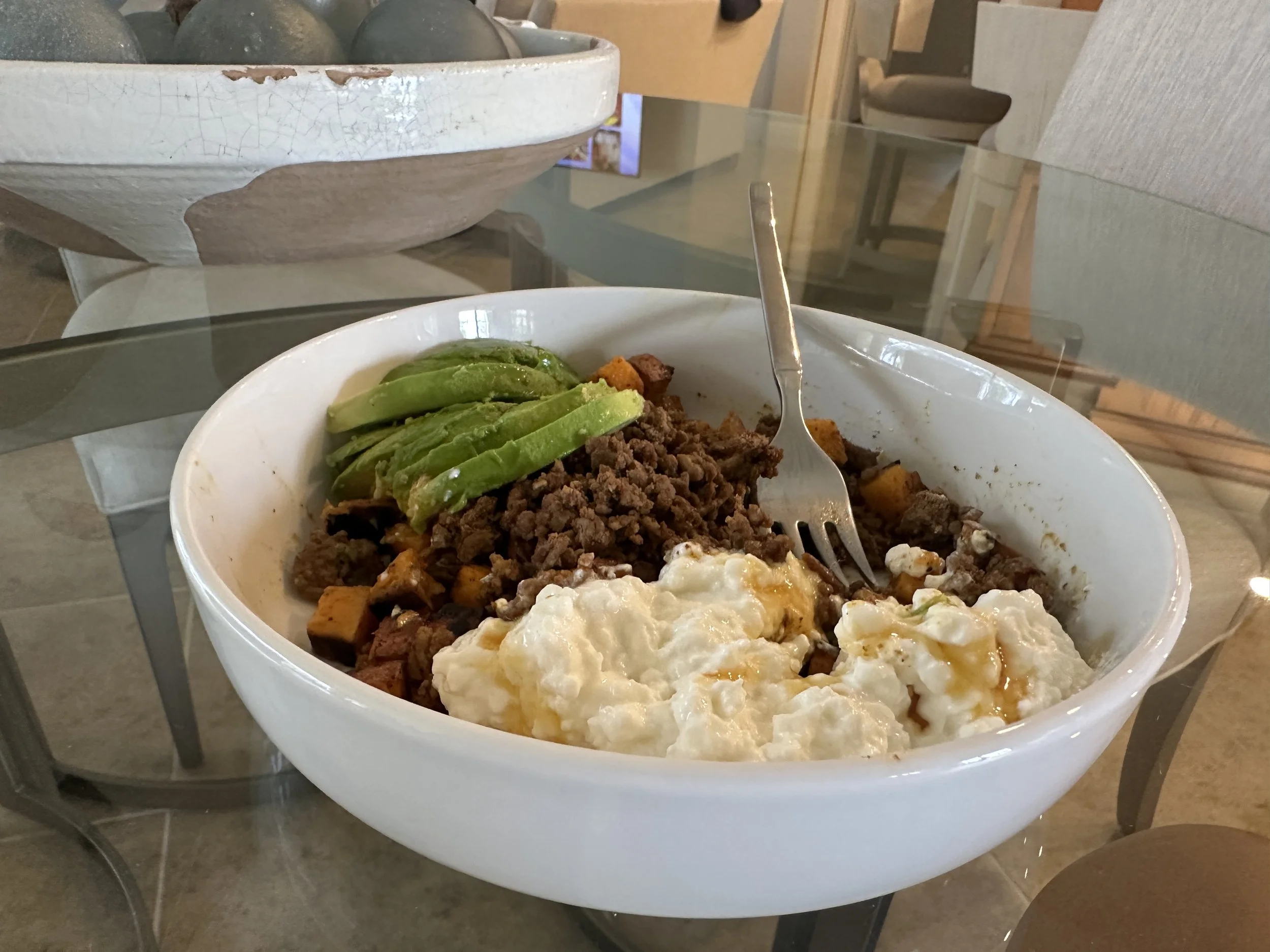 You get sweet roasted potatoes, savory beef, creamy cottage cheese, rich avocado, and a drizzle of spicy honey that pulls everything together.